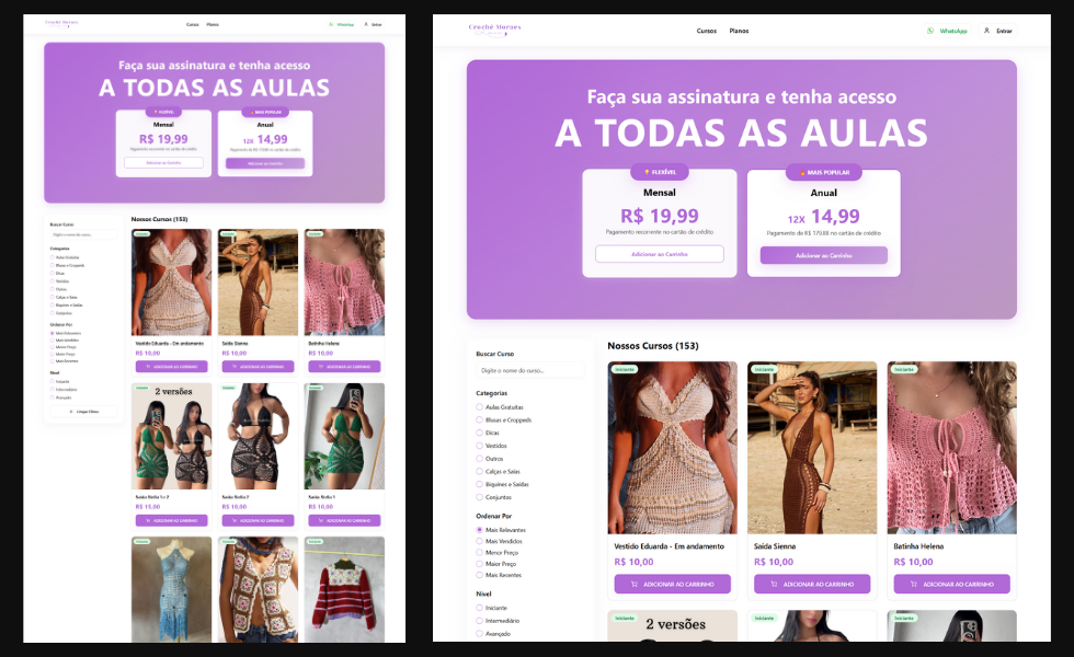 E-commerce completo para venda de cursos de crochê, com área de membros, sistema de pagamentos e mais de 150 aulas disponíveis.