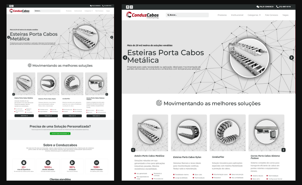 Site institucional com catálogo completo de esteiras porta cabos, soluções personalizadas e mais de 25 anos de experiência no mercado.